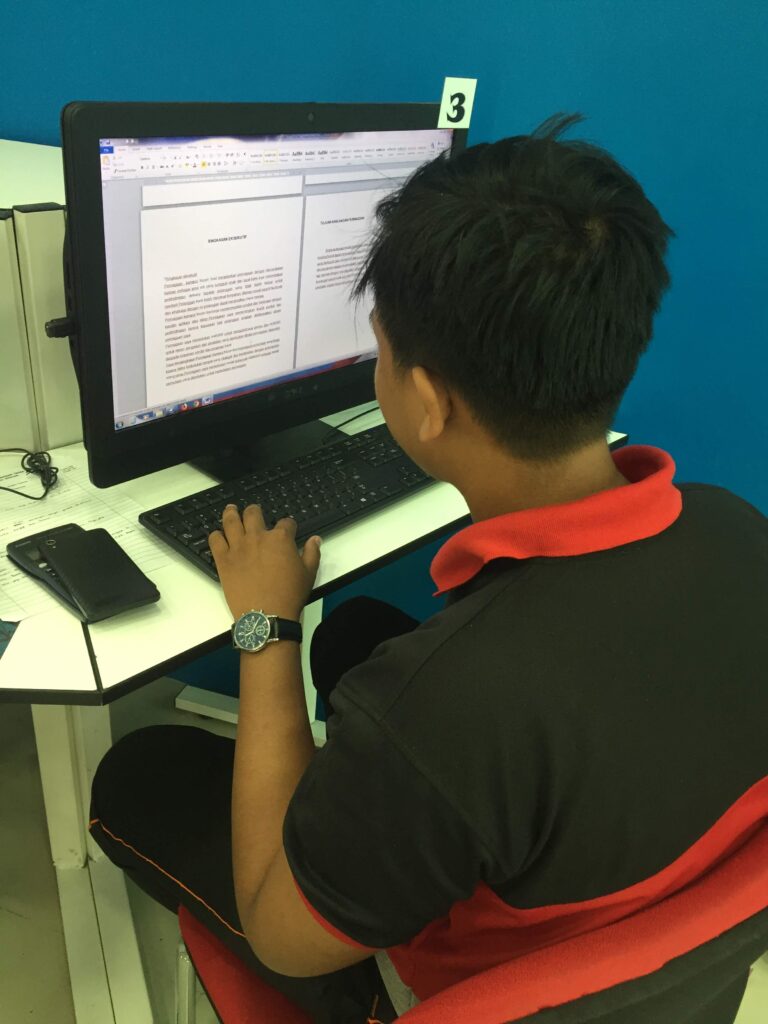 Petugas memberi tunjuk ajar kepada pelajar cara-cara menggunakan microsoft word dengan betul serta bantu pelajar menyiapkan kerja kursus mereka.