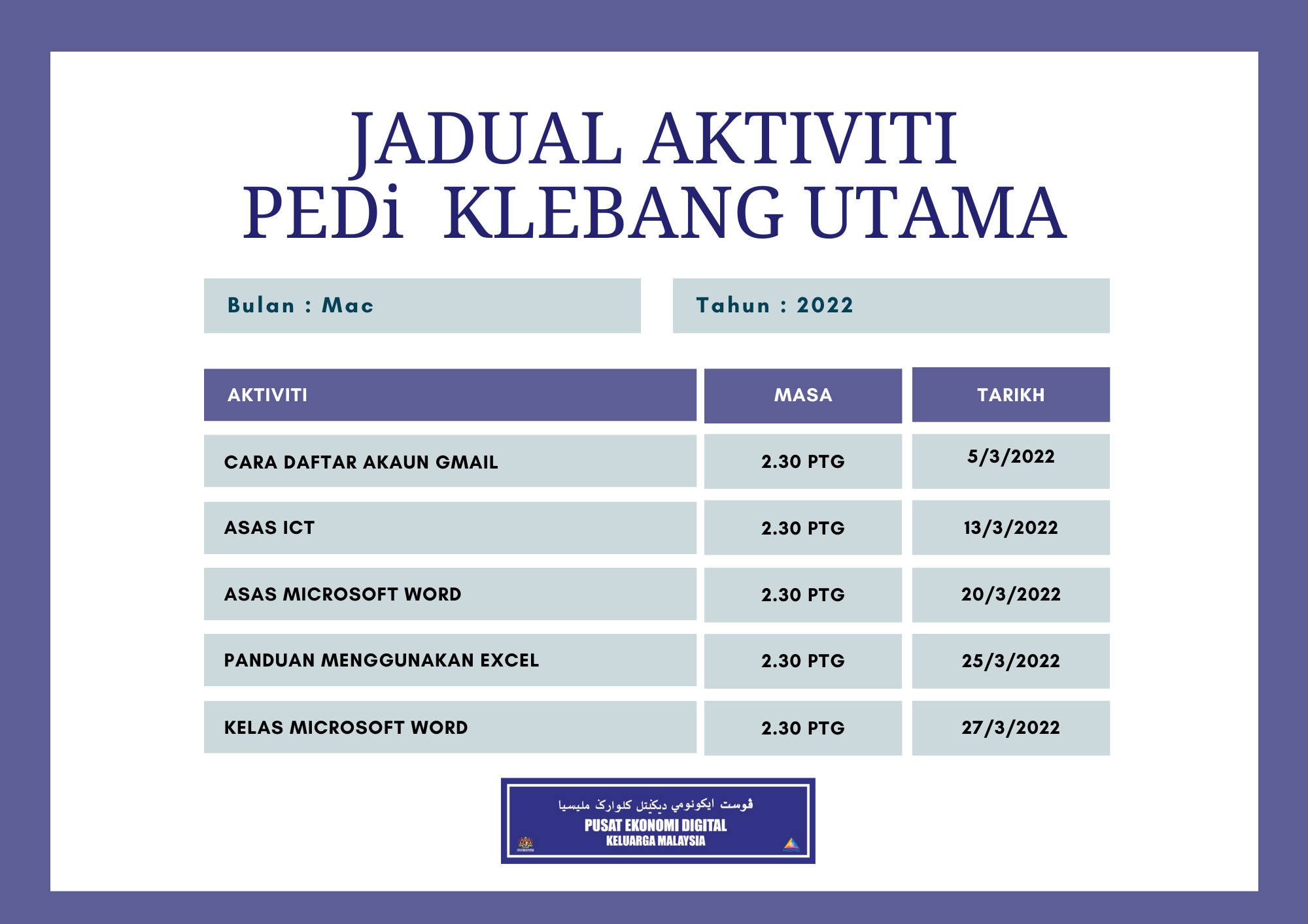 JADUAL AKTIVITI PEDi KLEBANG UTAMA (MAC)
